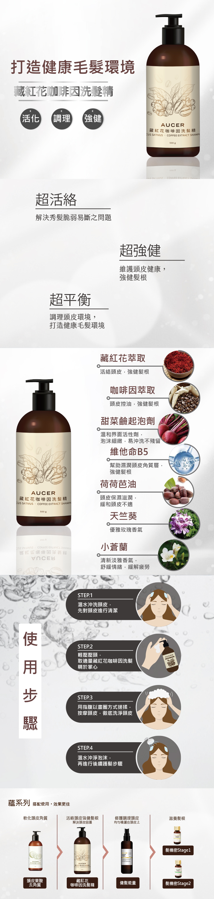 主成分:藏紅花萃取、咖啡因萃取、甜菜鹼起泡劑、維他命B5、荷荷芭油、天竺葵、小蒼蘭