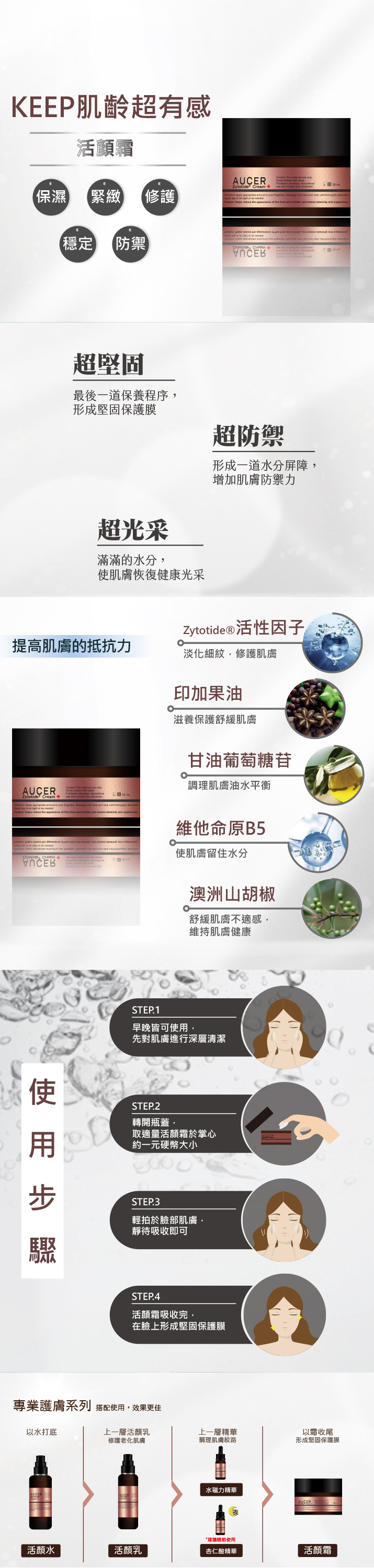 主成分:Zytotide獨家專利活性因子、印加果油、甘油葡萄糖苷、維他命B5、澳洲山胡椒