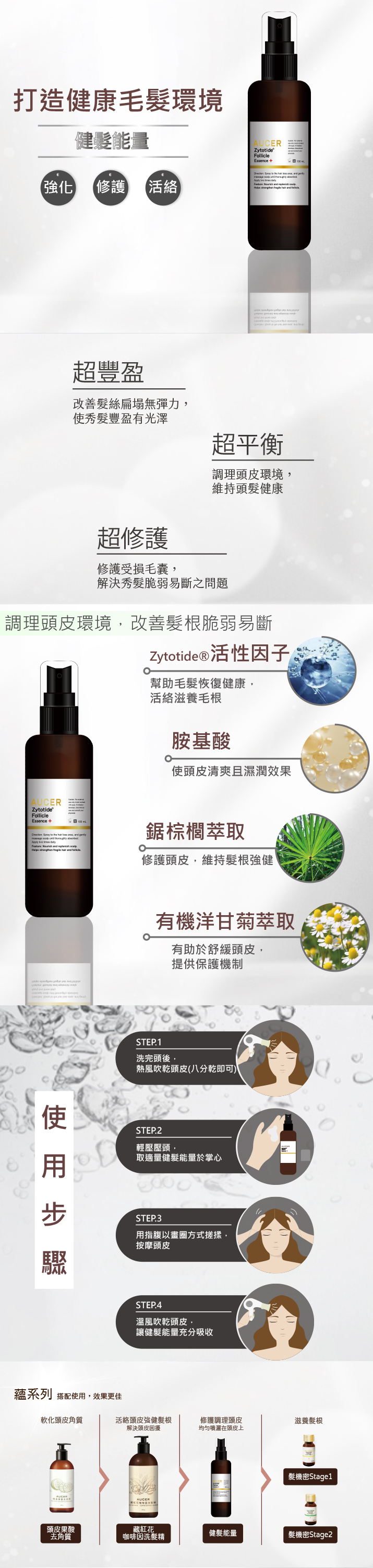 主成分:Zytotide獨家專利FSGF多胜肽活性因子、十合一胺基酸、鋸棕櫚萃取、有機洋甘菊萃取